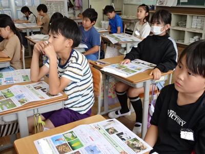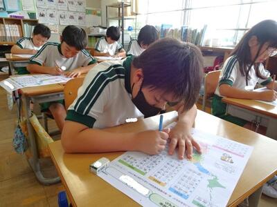 【3年生】1枚目の写真は、理科の「こん虫のかんさつ」の学習の様子です。前回はみんなで同じ昆虫を調べましたが、今日は違います。自分の調べたい昆虫を探してシートに書き込んでいました。