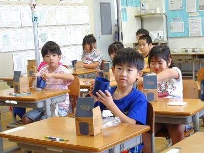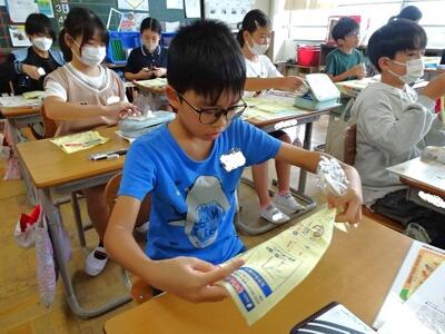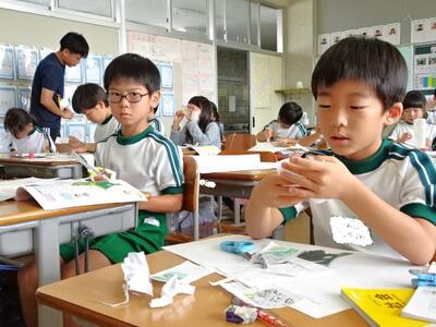 【1年生】1枚目の写真は、図画工作の「おってたてたら」の学習の様子です。今日は、出来上がった友だちの作品を鑑賞してまわっています。感心したところやすごいと思ったところをシートに記入しています。