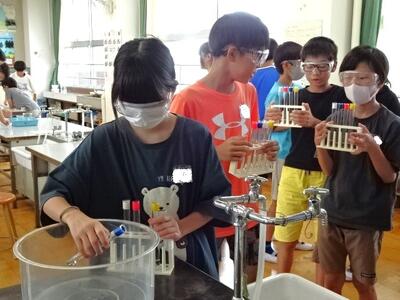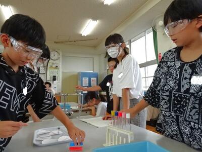 【6年生】1枚目の写真は、理科の「水よう液の性質」の学習の様子です。この学習では、酸性やアルカリ性などの水よう液を使います。今日は、その扱い方について水を使って体験しました。