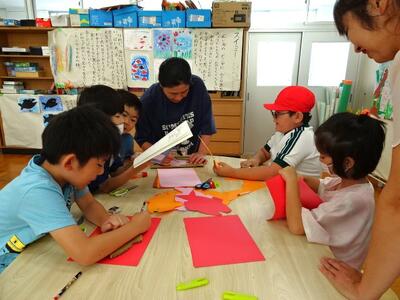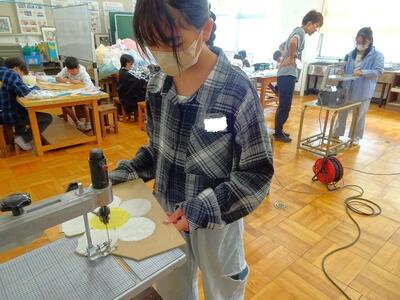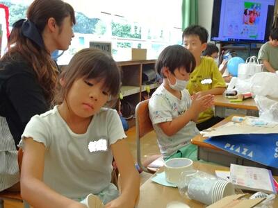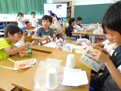 【4・5・6・7組】みんなで工作をしています。できあがるときれいな体操棒になりました。