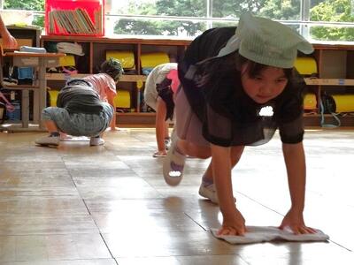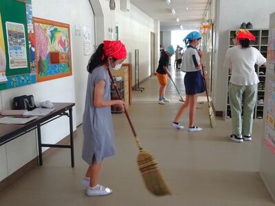 9月3日(火)から、新しい清掃班、新しい清掃場所になります。清掃の時間に初めて集まった子どもたちは、6年生の指示にしたがって役割を決め、さっそく清掃を始めました。