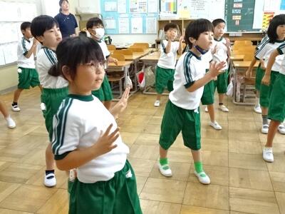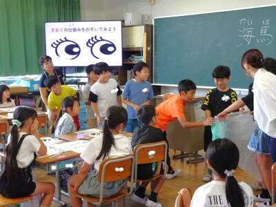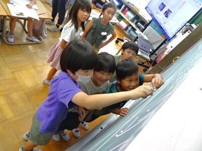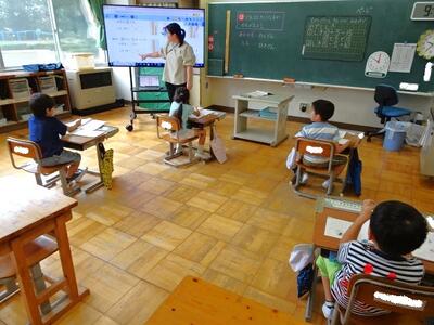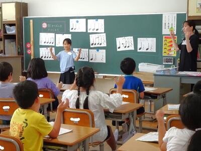 【1年生】1枚目の写真は、国語の「くじらぐも」の学習の様子です。子どもたちは「もっとたかく!もっとたかく!」というくじらぐもの台詞が大好きです。