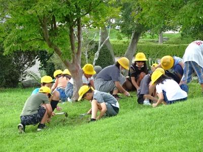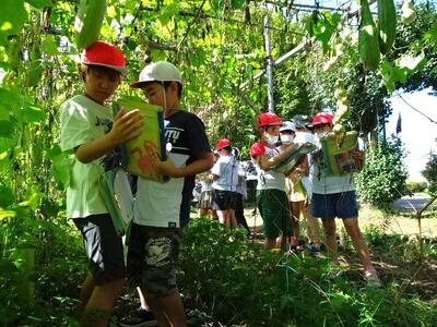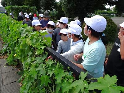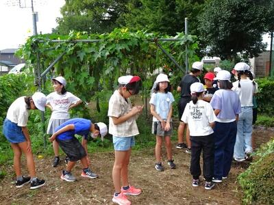 【4年生】春に種をまいて成長の様子を調べてきたヘチマがどうなったのか観察に来ました。緑に覆われたヘチマ棚に、大きくてかたいヘチマがたくさんなっていました。