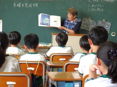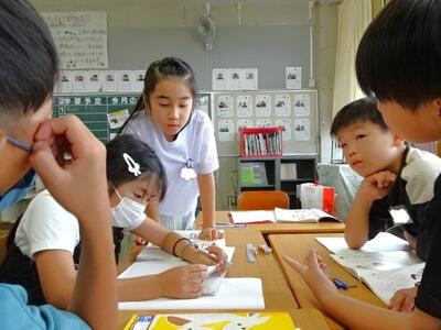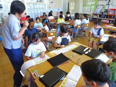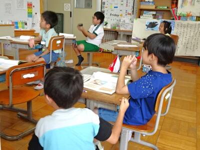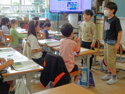 【1年生】1枚目の写真は、国語の「くじらぐも」の学習の様子です。「くじらぐも」も、いよいよ中身の読み取りに入りました。登場人物やくじらがどんな気持ちで言った台詞か、みんなで考えていました。