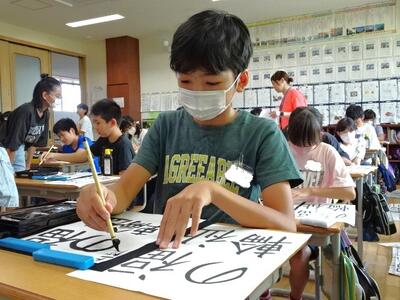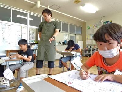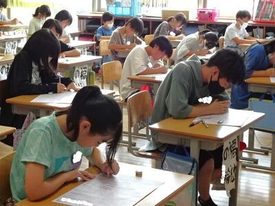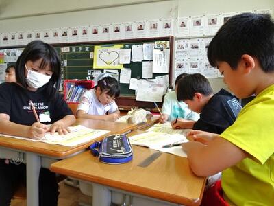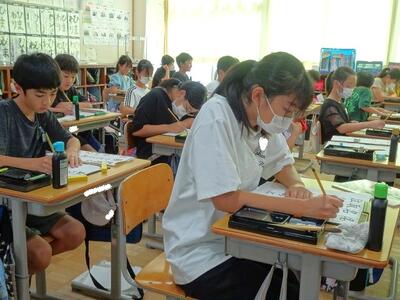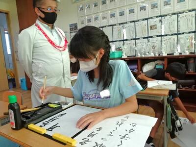 【3年生】1枚目の写真は、書写の時間の様子です。3年生の書写は、書道を始める大切な時期であり、専門の先生を外部指導者として年に10回程度きていただいています。基本をしっかりと教わることができます。