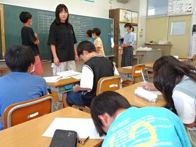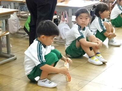 【2年生】1枚目の写真は、秋休みに課題について説明を受けている様子です。5日間しかない秋休みですから、宿題の量はそれほど多くはありません。子どもたちは、真剣に話を聞いていました。