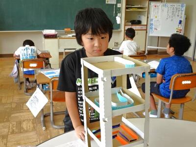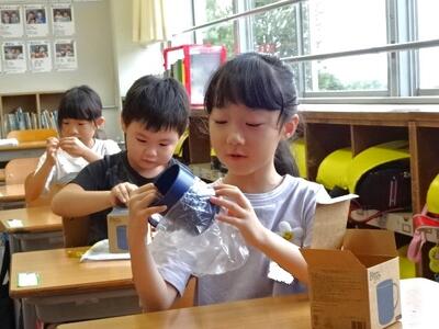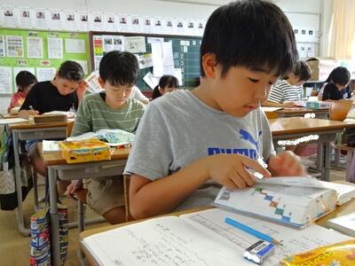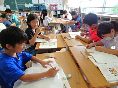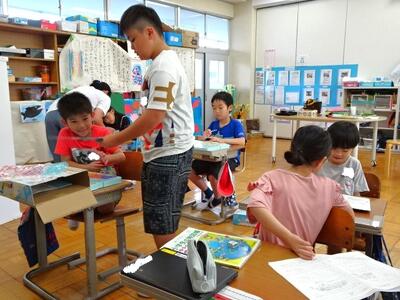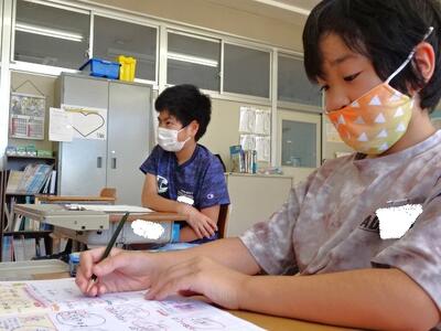 【2年生】1枚目の写真は、生活科の「うごくうごくわたしのおもちゃ」の学習の様子です。どんなものを作るかを決めた子どもたちは、さっそく設計図作りに取り組み始めました。