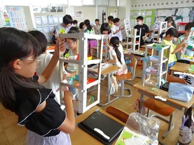 【6年生】1枚目の写真は、図画工作の「くるくるクランク」の学習の様子です。針金を回すと、クランクが上下する仕組みです。思い思いの発想を生かした作品作りをしていました。
