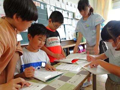 【2年生】1枚目の写真は、国語の「ことばでみちあんない」の学習の様子です。地図を見ながら、正確に伝えるにはどうしたらよいか話し合いました。