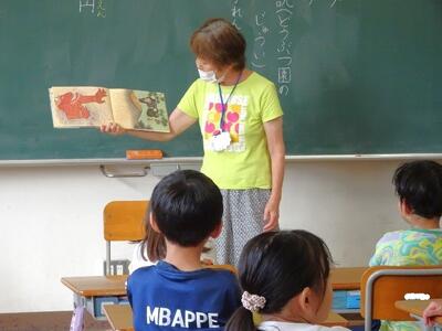 【1年生】1枚目から3枚目の写真は、国語の「くじらぐも」の学習の様子です。子どもたちの台詞やくじらぐもの台詞を、どんなふうに読むと物語の世界に近づくのか、声に出して読みながら考えています。