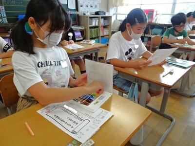 【2年生】1枚目の写真は、図画工作の「わっかでへんしん」の学習の様子です。今日から始まった新しい単元です。今日は、自分の作りたい物を想像しながら設計図作りを行いました。