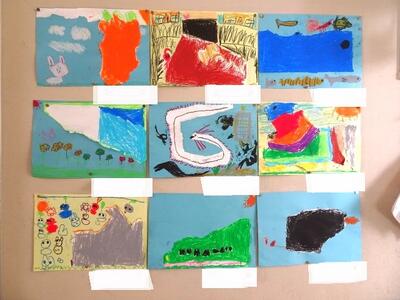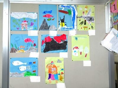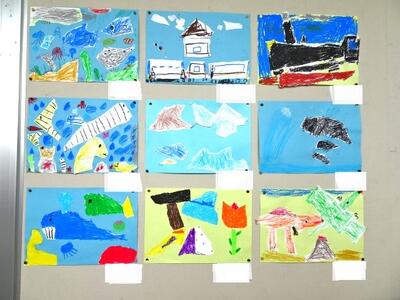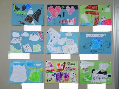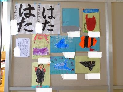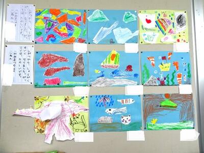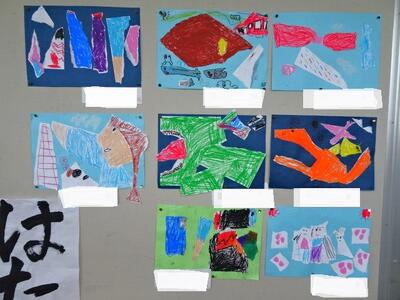 【1年生】1枚目の写真は、図画工作の「やぶいたかたちから うまれたよ」の学習の様子です。今日は、仕上がった友だちの作品をみて、お気に入りを3つ選びました。鑑賞もしっかりできるようになってきています。