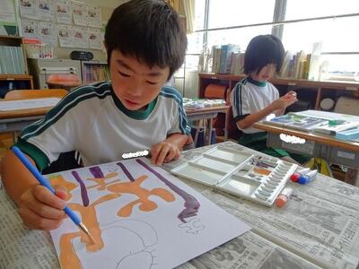 【4年生】1枚目の写真は、図画工作の「まぼろしの花」の学習の様子です。ついに完成に近づきました。色をぬったり、違う素材を貼り付けたりと自分の想いを表していました。