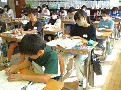 【3年生】1枚目の写真は、理科の「こん虫のかんさつ」の学習の様子です。今日は、自分が選んだ昆虫を、詳しい図鑑を見ながらスケッチを行いました。