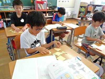 【3年生】1枚目の写真は、算数の「大きい数のかけ算のしかたを考えよう」の学習の様子です。新しい単元に入り、コース別に分かれて学習しています。