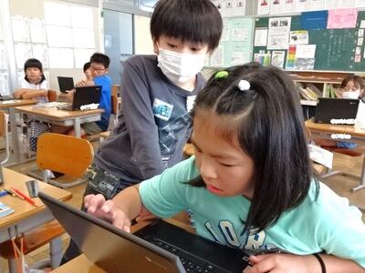 【5年生】1枚目と2枚目の写真は、外国語の「He can run fast. She can do kendama.」の学習の様子です。友だちの得意なことやできることなどを伝え合う内容です。今日は、タブレットを使ってできることを伝え合いました。
