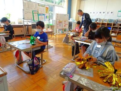 【2年生】1枚目と2枚目の写真は、図画工作の「わっかでへんしん」の学習の様子です。自分の頭の大きさに合わせたわっかに、いろいろな装飾を付けていきます。金色にしたり、模様を描いたりして、自分なりの工夫をしていました。