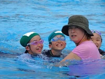 1年生にとって初めてのプール活動は、水に慣れる、水に顔をつけるところから始まりました。初めは恐る恐る入っていましたが、だんだんと慣れてきてもぐることができる子どもたちが増えてきました。