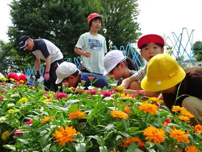 【4・5・6・7組】1枚目の写真は、花を材料にして「色水」作りに挑戦している様子です。アサガオなどの花で挑戦しました。