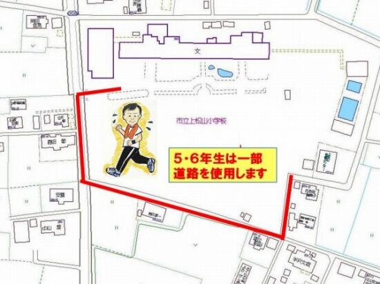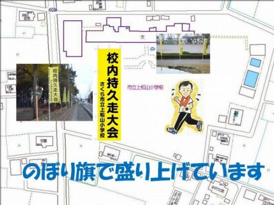 (1)2校時(低学年) (2)3校時(高学年) (3)4校時(中学年) の予定で持久走大会が開かれます。保護者の皆様のお越しをお待ちしています。真剣に、一生懸命走るお子さまの姿をぜひご覧ください。必見です。低・中学年は校内を走りますが、距離の調整の関係で5・6年生は今年度一部学校周辺の道路に出ます。(上図の赤線の部分)のぼり旗など若干、雰囲気も高まってきました。