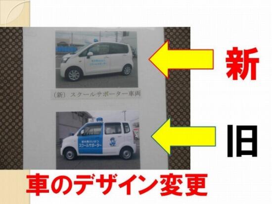 児童の登下校の安全、不審者対策、学校安全支援など日頃からお世話になっいるスクールサポーターさんの車のデザインが変わりました。過日の防犯訓練でサポーターさんの方から写真で紹介しながら説明がありました。この車は特に下校指導などの巡回に利用されるものです。道路でお見かけすることもあろうかと思います。ご承知おきください!(^^)!