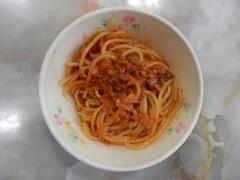今日はお楽しみの「おはなしランチメニュー」です。今日のメニューは「こまったさんのスパゲテイ」より、スパゲテイーミートソースです。こまったさんシリーズは、料理にまつわる本ばかりの大人気シリーズです。今日はレシピにならって、豚肉・たまねぎ・セロリをトマトと一緒にじっくりいためて作りました。今日のかくし味はよくいためたセロリです。(栄養士談)手間ひまがかかるものは実に美味しいです。