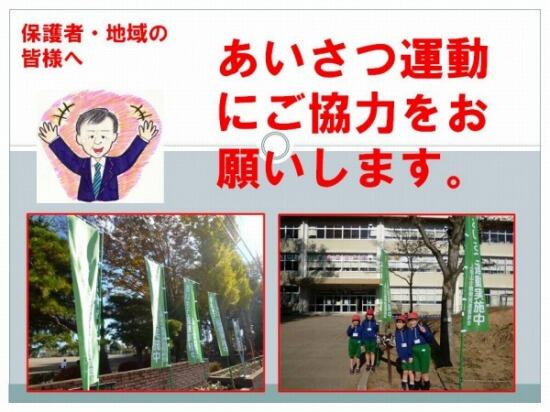 今年から昨年のさらなるバージョンアップをした「地域ぐるみのあいさつ運動」が展開されています。学校、さくら市青少年センター・氏家中生徒(卒業生)、PTA、地域などを地域ぐるみ一体となった運動です。来年もよろしくお願いします。
