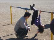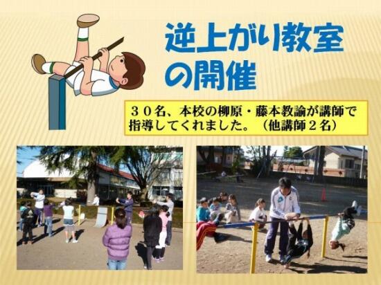今日も穏やかな1日です。10時から市教委主催の「さか上がり教室」が開催されました。抽選で選ばれた30名が参加しました。本校からも4名の名前がありました。4名の講師の指導のもと逆上がりを極める練習、できるようになるための練習を行いました。さすが体育専門の先生方と感心しました。学校のもつ教育力の地域への還元、今後も協力をしていきたいと思います(^_^)v