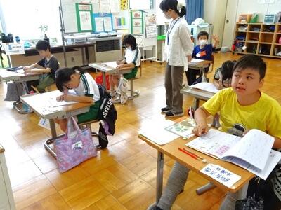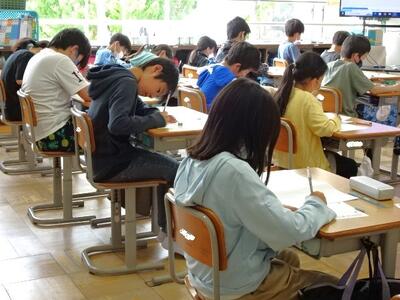 【4・5・6・7組】1枚目の写真は、国語の言葉に関するテストに挑戦している様子です。真剣です。