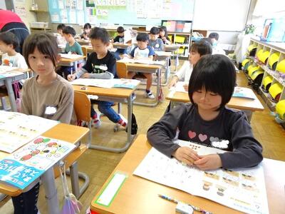 【1年生】1枚目の写真は、これから始まる水泳の授業に備えて、帽子のかぶり方や着替えの仕方について学習している様子です。オレンジ帽子をかぶった1年生がプールに入る日が近づいてきています。