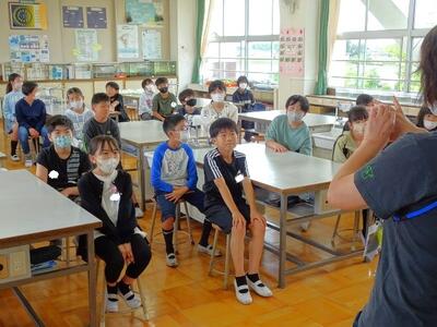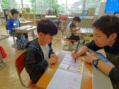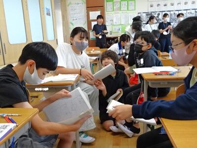 【5年生】1枚目の写真は、午前中に行った「陸上記録会」の自分の記録を知り、振り返っている様子です。自己ベストを更新した子どもたちがたくさんいました。「陸上記録会」の様子については、明日の午前中にHPにアップします。