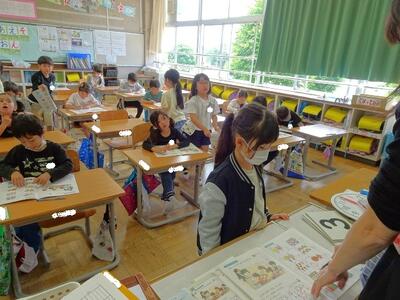 【2年生】1枚目の写真は、国語の「スイミー」の学習の様子です。今日は、大きな魚を追い払う作戦を立てている場面の学習です。たまたま赤いTシャツを着ていってしまったために、スイミーと同じ色だと騒ぎになってしまいました。ごめんなさい。