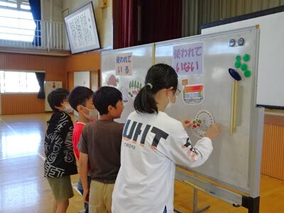 【4年生】1枚目の写真は、社会科の「ごみはどこへいくの」の学習の様子です。今日は、リサイクルの大切さについて学びました。ゴミとして捨てた物が新たなる物になることに驚きです。