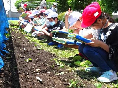 【4・5・6・7組】教材園の畑に水をあげた後、みんなで「あおむし」探しをしました。