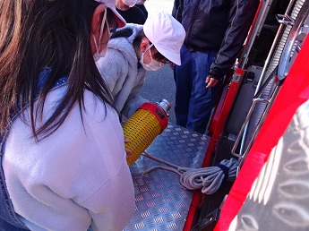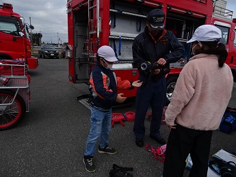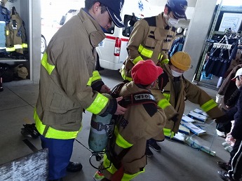 消防服を着させてもらい、酸素ボンベを背負わせてもらいました。とても重いことが分かりました。