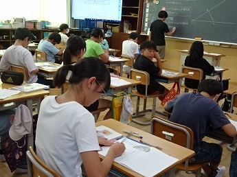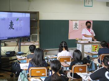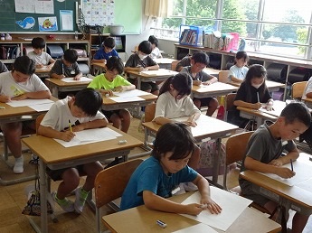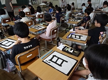 4年生の書写の学習では、バランスのよい字を書くコツについて真剣に聞いていました。