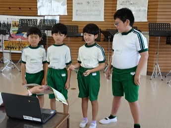 3年生は音楽で、グループの友達と歌い方を工夫して歌っている様子をタブレットで記録しました。書写では、「おれ」のコツをつかんで、立派な文字に仕上げました。