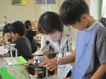 5年生は、理科の「花から実へ」の単元で、顕微鏡を使って花粉の観察をしました。