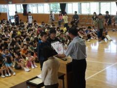 本日6月18日朝、1ヶ月ぶりに全校集会をしました。内容としては、「上松山小の児童の皆さん全員が仲良く遊んだり、勉強しているのでうれしいです。」「全国植樹祭に参加し、特選の賞状をいただいてきました。」「感謝の気持ちをもとう。」「困っている人いたら自分のできることをしよう。」などの話をしました。