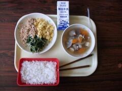 牛乳 セルフ3色丼(ごはん とりそぼろ いりたまご おひたし)けんちんじる