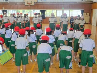 午前中の活動を終えて「退所式」を行いました。自然の家の先生のお話を聞いた後、感謝の気持ちを込めて「ありがとございました」と挨拶をしました。学校に到着してから「帰校式」を行い、無事帰宅の途へつきました。
