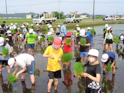 5年生の総合的な学習の時間の一つに「米作りに挑戦しよう」という単元があります。本校の東側は稲作が盛んであり、本校の特色ある行事にもなっています。この単元では、田植えから稲刈り、収穫後の食事までを体験することで、農業に携わる人々の苦労や喜びを味わいながら、お米についての理解を深めることを目的としています。今日は、しっかりと田植えを体験することができました。