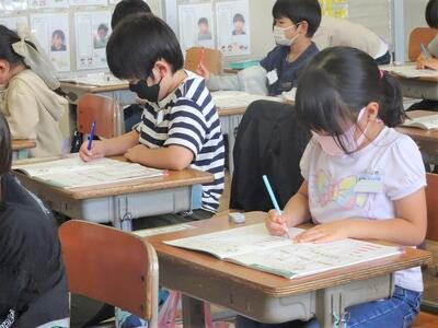 筆や硯を使った習字の学習は、3年生から始まります。本校では、3年生の書写の時間の何時間かを、専門家をお呼びして教えてもらっています。5月に6日(金)と9日(月)には、2時間ずつ早速専門家の先生に来ていただきました。この日は、道具一つ一つの使い方や片付けの仕方、筆の取り扱いなどについて教わりました。習字の学習の一番の基本です。子どもたちは、集中して姿勢良く、取り組んでいました。