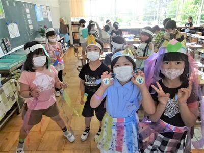 【2年生】2枚目の写真は、図工の作品作りをしている場面です。たくさんの飾りを付けて変身しているのが分かりますね。3枚目の写真は、その図工の作品を着た姿をクロムブックで撮影する仕方を学習しています。今は、画像に残すことができるので、自分の姿を見ることができますね。