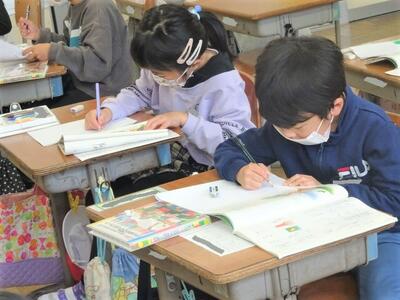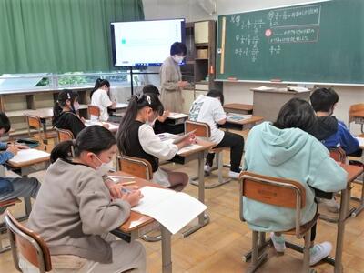 【3年生】1枚目の写真は、算数の少人数指導の様子です。3年生もこの少人数の学習に慣れてきたようで、集中して学習していました。クラスを解体して5クラスに分けているので、いつもと違う雰囲気がいいのかもしれません。