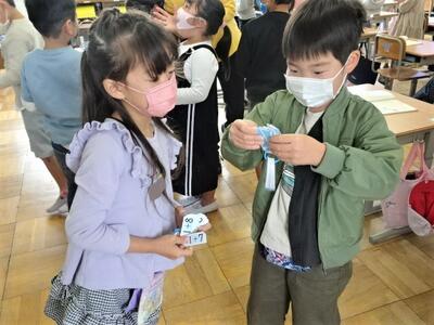 【2年生】2年生も新体力テストの測定に挑戦していました。シャトルランは、5年生が数えるのを手伝ってくれました。図工の「わっかでへんしん」では、上手な飾りをつけていてファッションショーのようでした。