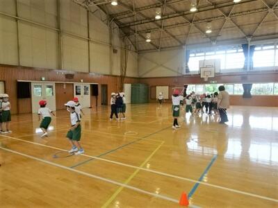 【1年生】2枚目の写真は、6年生に手伝ってもらいながら、シャトルランの想定をした時の写真です。6年生に付き添ってもらいながら、自分の力をしっかり出して走っていました。