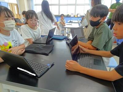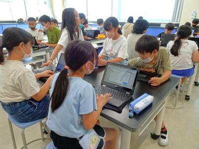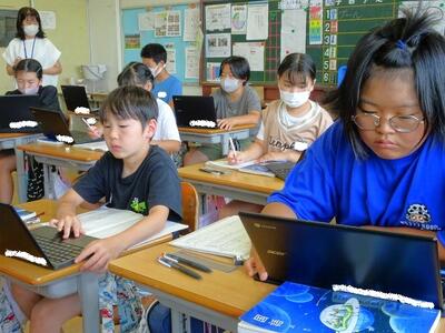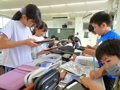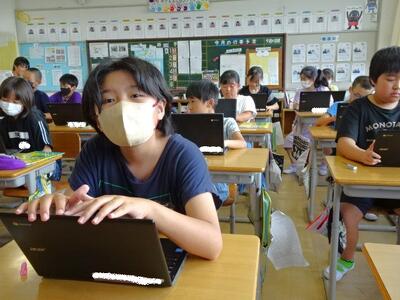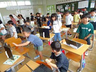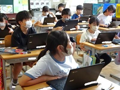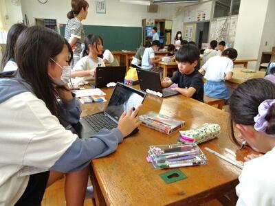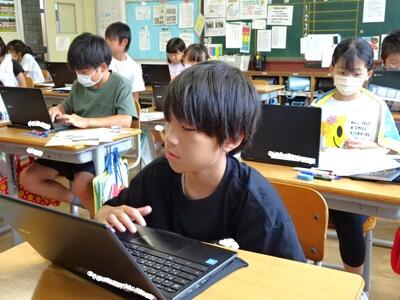 【5年生】1枚目の写真は、理科の「台風と気象情報」の学習の様子です。台風はどのように発生し、どのように動くのか調べていきます。もうすぐ台風の季節がやってきます。生活に役立ちますね。