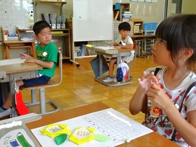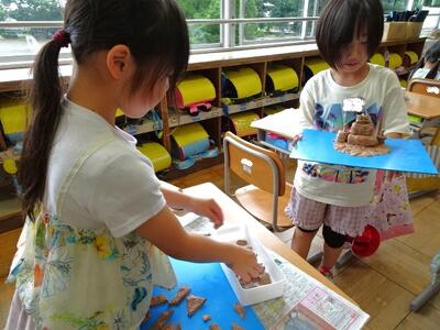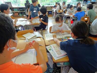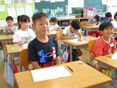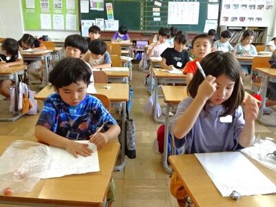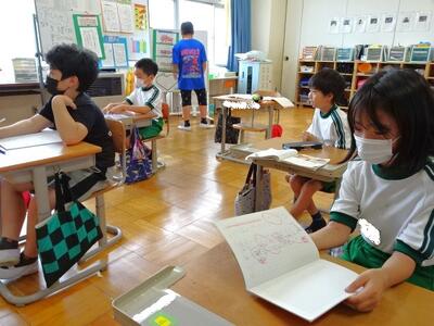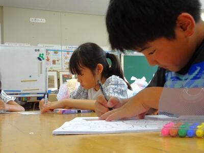 【1年生】1枚目の写真は、生活科の学習の様子です。「てづくりみずでっぽうであそぼう」という活動で、遊ぶための的や印をどんなふうに作るのか、一人一人できあがりの図を書いています。