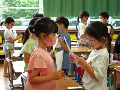 【2年生】1枚目の写真は、生活科の学習の様子です。机の上に収穫したミニトマトがのっていますね。自分の野菜の観察から教室に戻ってきて、記録のカードに様子を記入してます。